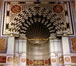 A miḥrāb, also spelled as mehrab is a semicircular niche in the wall of a mosque that faces the qiblah (i.e. the "front" of the mosque); the imam stands in this niche and leads prayer. Given that the imam typically stands alone in the frontmost row, this niche's practical effect is to save unused space.[79] The minbar is a pulpit from which the Friday sermon is delivered. While the minbar of Muhammad was a simple chair, later it became larger and attracted artistic attention. Some remained made of wood, albeit exquisitely carved, while others were made of marble and featured friezes.[80]