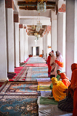 Many mosques today will put the women behind a barrier or partition or in another room. Mosques in South and Southeast Asia put men and women in separate rooms, as the divisions were built into them centuries ago. In nearly two-thirds of American mosques, women pray behind partitions or in separate areas, not in the main prayer hall; some mosques do not admit women at all due to the lack of space and the fact that some prayers, such as the Friday Jumuʻah, are mandatory for men but optional for women.[115] Although there are sections exclusively for women and children, the Grand Mosque in Mecca is desegregated.[116] In a number of mosques the women section is located above the main prayer hall, elevated in the background as stairs-separated gallery or plateau (surface-shortened to the back relative to the bottom main part). It usually has a perforated fence at the front, through which the imam or mullah and the other male worshippers in the main hall can be partially seen.