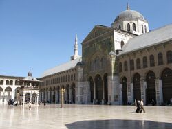 According to early Muslim historians, towns that surrendered without resistance and made treaties with the Muslims were allowed to retain their churches and the towns captured by Muslims had many of their churches converted to mosques.[101] One of the earliest examples of these kinds of conversions was in Damascus, Syria, where in 705 Umayyad caliph Al-Walid I bought the church of St. John from the Christians (which used to be a Roman temple and an Aramean temple prior to that),[102][103][104] and had it demolished and rebuilt as a mosque in exchange for building a number of new churches for the Christians in Damascus. Overall, Abd al-Malik ibn Marwan (Al-Waleed's father) is said to have transformed 10 churches in Damascus into mosques.[105]