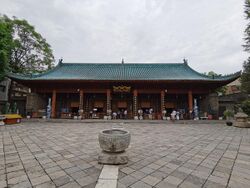One of first grand mosques in East Asia was established in the eighth century in Xi'an (at the time it was called Chang'an and it was the world's largest city).[46] The Great Mosque of Xi'an, whose current building dates from the 18th century, does not replicate the features often associated with mosques elsewhere.[47] Minarets were initially prohibited by the state.[48] Following traditional Chinese architecture, the Great Mosque of Xi'an, like many other mosques in eastern China, resembles a pagoda, with a green roof instead of the yellow roof common on imperial structures in China. Mosques in western China were more likely to incorporate elements, like domes and minarets, traditionally seen in mosques elsewhere.[47]