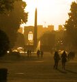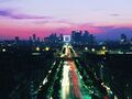 The Arc de Triomphe from La Défense 5 km (3 mi) away, showing how precisely the axis is aligned.