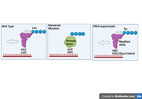 Because nonsense mutations result in altered mRNA with a premature stop codon, one way of suppressing the damage done to the final protein's function is to alter the tRNA that reads the mRNA. These tRNA’s are termed suppressor tRNA's. If the stop codon is UAG, any other amino acid tRNA could be altered from its original anticodon to AUC so it will recognize the UAG codon instead. This will result in the protein not being truncated, but it may still have an altered amino acid. These suppressor tRNA mutations are only possible if the cell has more than one tRNA that reads a particular codon, otherwise the mutation would kill the cell. The only stop codons are UAG, UAA, and UGA. UAG and UAA suppressors read their respective stop codons instead of their original codon, but UAA suppressors also read UAG due to wobble base pairing. UGA suppressors are very rare. Another hurdle to pass in this technique is the fact that stop codons are also recognized by release factors, so the tRNA still needs to compete with the release factors to keep the translation going. Because of this, suppression is usually only 10-40% successful. These suppressor tRNA mutations also target stop codons that are not mutations, causing some proteins to be much longer than they should be. Only bacteria and lower eukaryotes can survive with these mutations, mammal and insect cells die as a result of a suppressor mutation.[4]