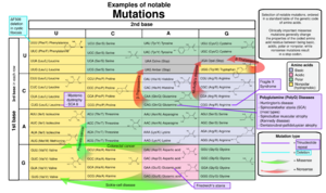 Missense mutations differ from nonsense mutations since they are point mutations that exhibit a single nucleotide change to cause substitution of a different amino acid. A nonsense mutation also differs from a nonstop mutation, which is a point mutation that removes a stop codon. About 10% of patients facing genetic diseases have involvement with nonsense mutations.[5] Some of the diseases that these mutations can cause are Duchenne muscular dystrophy (DMD), cystic fibrosis[6] (CF), spinal muscular atrophy (SMA), cancers, metabolic diseases, and neurologic disorders.[5][7] The rate of nonsense mutations is variable from gene-to-gene and tissue-to-tissue but gene silencing occurs in every patient with a nonsense mutation.[5]