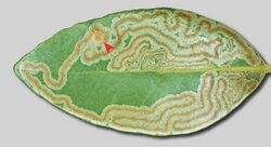 Persea borbonia leaf with leaf mines by larvae of the moth