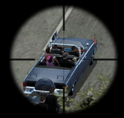 JFK Reloaded includes a "Chaos Meter" that controls how heavily the motorcade's drivers are affected by panic.[7] Following each game, individual shots can be replayed in slow motion and with a close-up on each bullet.[3][6] The scene can be viewed from several angles, including from the grassy knoll, the location of the Zapruder film, and a virtual camera mounted to Kennedy's limousine.[6][8] The player can further enable blood splatter effects and exaggerated physics.[3][9]