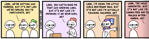 Aparentemente, la aceptación de las personas trans y gay dirige a la pedofilia y bestialidad. Para la sorpresa de ninguno, esto no es cierto.[4] La ironía es que los conservadores habitualmente tienen problemas con la pedofilia y abuso infantil entre sus rangos.[5] Ademas, vea como StoneToss comúnmente retrata a la gente LGBTQIA+ con pelo colorado y mujeres trans con vello facial.