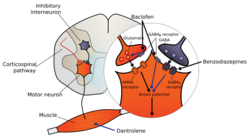The benzodiazepines, such as diazepam, interact with the GABAA receptor in the central nervous system. While it can be used in patients with muscle spasm of almost any origin, it produces sedation in most individuals at the doses required to reduce muscle tone.[5]