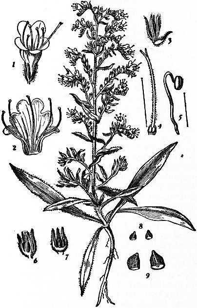 From Britannica 11th Edition (1911) Boraginaceae, an order of plants belonging to the sympetalous section of dicotyledons, and a member of the series Tubiflorae. It is represented in Britain by bugloss (Echium) (fig. 1), comfrey (Symphytum), Myosotis, hounds-tongue (Cynoglossum) (fig. 2), and other genera, while borage (Borago officinalis) (fig. 3) occurs as a garden escape in waste ground. The plants are rough-haired annual or perennial herbs, more rarely shrubby or arborescent, as in Cordia and Ehretia, which are tropical or sub-tropical. The leaves, which are generally alternate, are usually entire and narrow: the radical leaves in some genera, as Pulmonaria (lungwort) and Cynoglossum, differ in form from the stem-leaves, being generally broader and sometimes heart-shaped. A characteristic feature is the one-sided (dorsiventral) inflorescence, well illustrated in forget-me-not and other species of Myosotis; the cyme is at first closely coiled, becoming uncoiled as the flowers open. At the same time there is often a change in colour in the flowers, which are red in bud, becoming blue as they expand, as in Myosotis, Echium, Symphytum and others. The flowers are generally regular; the form of the corolla varies widely. Thus in borage it is rotate, tubular in comfrey, funnel-shaped in hounds-tongue, and salver-shaped in alkanet (Anchusa); the throat is often closed by scale-like outgrowths from the corolla, forming the so-called corona. A departure from the usual regular corolla occurs in Echium and a few allied genera, where it is oblique; in Lycopsis it is also bent.
