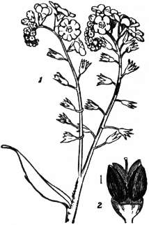 | Fig. 2.—(1) Inflorescence of Forget-me-not; (2) ripe fruits. |
