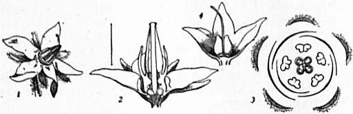 | Fig. 3.—(1) Flower of Borage; (2) same in vertical section enlarged; (3) horizontal plan of flower; (4) flower of Comfrey after removal of corolla, showing unripe fruit. |