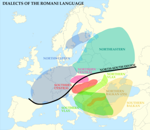 Romani (/ˈrɒməni, ˈroʊ-/ ROM-ə-nee, ROH-;[13][14][15][16] also Romany, Romanes /ˈrɒmənɪs/ ROM-ən-iss,[17] Roma; Template:Lang-rom) is an Indo-Aryan macrolanguage of the Romani communities.[18] According to Ethnologue, seven varieties of Romani are divergent enough to be considered languages of their own. The largest of these are Vlax Romani (about 500,000 speakers),[19] Balkan Romani (600,000),[20] and Sinte Romani (300,000).[21] Some Romani communities speak mixed languages based on the surrounding language with retained Romani-derived vocabulary – these are known by linguists as Para-Romani varieties, rather than dialects of the Romani language itself.[22]