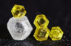 Synthetic diamonds for use as gemstones are grown by HPHT[38] or CVD[105] methods, and represented approximately 2% of the gem-quality diamond market as of 2013.[106] However, there are indications that the market share of synthetic jewelry-quality diamonds may grow as advances in technology allow for larger higher-quality synthetic production on a more economic scale.[107] They are available in yellow, pink, green, orange, blue and, to a lesser extent, colorless (or white). The yellow color comes from nitrogen impurities in the manufacturing process, while the blue color comes from boron.[36] Other colors, such as pink or green, are achievable after synthesis using irradiation.[108][109] Several companies also offer memorial diamonds grown using cremated remains.[110]