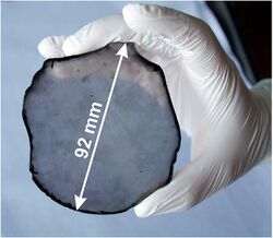 Diamond is hard, chemically inert, and has high thermal conductivity and a low coefficient of thermal expansion. These properties make diamond superior to any other existing window material used for transmitting infrared and microwave radiation. Therefore, synthetic diamond is starting to replace zinc selenide as the output window of high-power CO2 lasers[83] and gyrotrons. Those synthetic polycrystalline diamond windows are shaped as disks of large diameters (about 10 cm for gyrotrons) and small thicknesses (to reduce absorption) and can only be produced with the CVD technique.[84][85] Single crystal slabs of dimensions of length up to approximately 10 mm are becoming increasingly important in several areas of optics including heatspreaders inside laser cavities, diffractive optics and as the optical gain medium in Raman lasers.[86] Recent advances in the HPHT and CVD synthesis techniques have improved the purity and crystallographic structure perfection of single-crystalline diamond enough to replace silicon as a diffraction grating and window material in high-power radiation sources, such as synchrotrons.[87][88] Both the CVD and HPHT processes are also used to create designer optically transparent diamond anvils as a tool for measuring electric and magnetic properties of materials at ultra high pressures using a diamond anvil cell.[89]