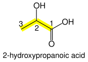3–CH(OH)–COOH (lactic acid) is named 2-hydroxypropanoic acid with no "1" stated. Some traditional names for common carboxylic acids (such as acetic acid) are in such widespread use that they are retained in IUPAC nomenclature,[5] though systematic names like ethanoic acid are also used. Carboxylic acids attached to a benzene ring are structural analogs of benzoic acid (Ph–COOH) and are named as one of its derivatives.