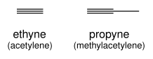 Alkynes are named using the same system, with the suffix "-yne" indicating a triple bond: ethyne (acetylene), propyne (methylacetylene).