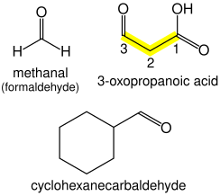 2COOH is 3-oxopropanoic acid. If the carbon in the carbonyl group cannot be included in the attached chain (for instance in the case of cyclic aldehydes), the prefix "formyl-" or the suffix "-carbaldehyde" is used: C