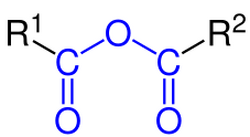 Acid anhydrides (R–C(=O)–O–C(=O)–R) have two acyl groups linked by an oxygen atom. If both acyl groups are the same, then the name of the carboxylic acid with the word acid is replaced with the word anhydride and the IUPAC name consists of two words. If the acyl groups are different, then they are named in alphabetical order in the same way, with anhydride replacing acid and IUPAC name consists of three words. For example, CH