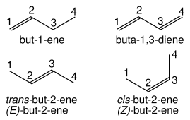 2 is buta-1,3-diene. Simple cis and trans isomers may be indicated with a prefixed cis- or trans-: cis-but-2-ene, trans-but-2-ene. However, cis- and trans- are relative descriptors. It is IUPAC convention to describe all alkenes using absolute descriptors of Z- (same side) and E- (opposite) with the Cahn–Ingold–Prelog priority rules (see alse E–Z notation).