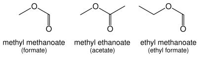 3) or dimethyl phthalate that are based on common acids, IUPAC recommends use of these established names, called retained names. The "-oate" changes to "-ate." Some simple examples, named both ways, are shown in the figure above.