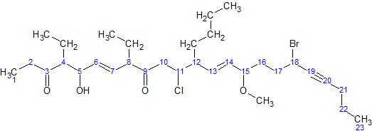 The final name is (6E,13E)-18-bromo-12-butyl-11-chloro-4,8-diethyl-5-hydroxy-15-methoxytricosa-6,13-dien-19-yne-3,9-dione.