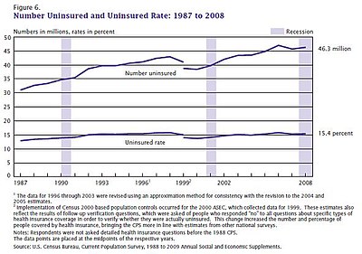 The uninsured proportion was stable at 14–15% from 1990 to 2008, then rose to a peak of 18% in Q3 2013 and rapidly fell to 11% in 2015.[12] The proportion without insurance has stabilized at 9%.[5]