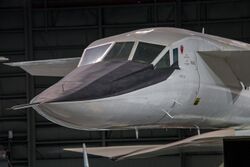 The US XB-70 Valkyrie and the Soviet Sukhoi T-4 Mach 3 strategic bombers both had droop-noses. The Valkyrie nose though was rigid, with only the upper visor ahead of the windscreen lowering, and the outer panels of the windscreen moving to a more vertical position. In flight, the visor and windscreen raised to form a straight panel.
