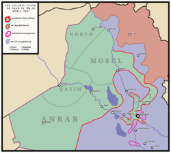 In response to a law allowing for the partitioning of Iraq into autonomous regions, members of the Mutayibeen Coalition (Khalf al-Mutayibeen[104]), a coalition of Sunni insurgent groups including Al Qaeda in Iraq, announced the creation of the Islamic State of Iraq encompassing parts of 6 of Iraq's 18 provinces on 15 October 2006.[104][105] Yet another show of defiance came on 18 October when Sunni fighters brazenly paraded in Ramadi. Similar parades were held two days later in several towns across western Iraq, two of which occurred within two miles of U.S. military bases.