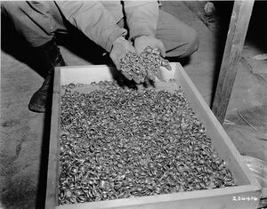 Another form of acquisition is theft. In the 1940s, Nazi Germany forcibly obtained the possessions of Jews, sometimes in collaboration with other parties. Most victims who died in death camps and Nazi concentration camps were robbed of all valuable property by the state, which was then sold or, in the case of bullion, sent to the Reichsbank. For example, in 1945 the Hungarian Gold Train was established to transport the property of Hungarian Jews to Berlin. Once the Jews had been deported to German concentration camps, the valuables were sorted into categories such that their owners could no longer be identified.[4] In the late 1930s and throughout World War II, Germany would increase its unofficial gold reserves by expropriating gold from foreign governments, including $223m from Belgium and $193m from the Netherlands.[5] Some of the Nazi gold was exchanged for cash,[6] and some deposited in financial institutions, including $316 million of the looted gold at the Swiss National Bank.[7] Of the nearly 100 tons of gold laundered through Swiss banks, only 4 tons was returned.[6] The Banco de Portugal, the central bank of Portugal, would regularly purchase Nazi gold held at the Swiss National Bank, according to a 1944 document from the American Overseas Special Services.[8][9]