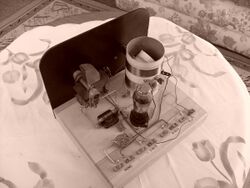 A related circuit, the superregenerative detector, found several highly important military uses in World War II in Friend or Foe identification equipment and in the top-secret proximity fuze. An example here is the miniature RK61 thyratron marketed in 1938, which was designed specifically to operate like a vacuum triode below its ignition voltage, allowing it to amplify analog signals as a self-quenching superregenerative detector in radio control receivers,[35] and was the major technical development which led to the wartime development of radio-controlled weapons and the parallel development of radio controlled modelling as a hobby.[36]