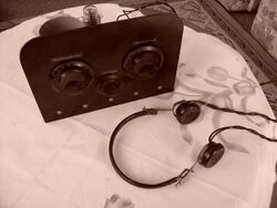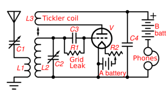 The gain of any amplifying device, such as a vacuum tube, transistor, or op amp, can be increased by feeding some of the energy from its output back into its input in phase with the original input signal. This is called positive feedback or regeneration.[13][3] Because of the large amplification possible with regeneration, regenerative receivers often use only a single amplifying element (tube or transistor).[14] In a regenerative receiver the output of the tube or transistor is connected back to its own input through a tuned circuit (LC circuit).[15][16] The tuned circuit allows positive feedback only at its resonant frequency. In regenerative receivers using only one active device, the same tuned circuit is coupled to the antenna and also serves to select the radio frequency to be received, usually by means of variable capacitance. In the regenerative circuit discussed here, the active device also functions as a detector; this circuit is also known as a regenerative detector.[16] A regeneration control is usually provided for adjusting the amount of feedback (the loop gain). It is desirable for the circuit design to provide regeneration control that can gradually increase feedback to the point of oscillation and that provides control of the oscillation from small to larger amplitude and back to no oscillation without jumps of amplitude or hysteresis in control.[17][18][19][20]