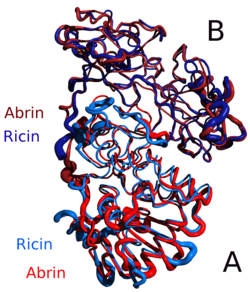 In terms of structure, ricin closely resembles abrin-a, an isomer of abrin. The quaternary structure of ricin is a globular, glycosylated heterodimer of approximately 60–65 kDa.[5] Ricin toxin A chain and ricin toxin B chain are of similar molecular weights, approximately 32 kDa and 34 kDa, respectively.