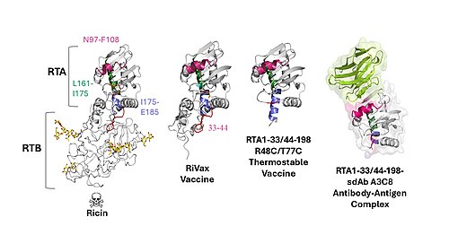 Ricin toxin vaccines have emerged as a focus in biodefense research. Two recombinant A subunit (RTA)-based vaccines, RiVax and RVEc (also known as RTA1-33/44-198),[59][60] have completed Phase I clinical trials, and were found to be safe.[61] These vaccines are based on modified versions of the ricin toxin A-chain, designed to reduce toxicity while maintaining immunogenicity.