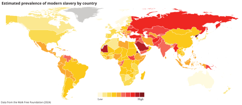 The Walk Free Foundation reported in 2018 that slavery in wealthy Western societies is much more prevalent than previously known, in particular the United States and Great Britain, which have 403,000 (one in 800) and 136,000 slaves respectively. Andrew Forrest, founder of the organization, said that "The United States is one of the most advanced countries in the world yet has more than 400,000 modern slaves working under forced labour conditions."[324] An estimated 40.3 million are enslaved globally, with North Korea having the most slaves at 2.6 million (one in 10). Of the estimated 40.3 million people in contemporary slavery, 71% are women and 29% are men. The report found of the 40.3 million in modern slavery, 15.4 million are in forced marriages and 24.9 million are in forced labor.[325] The foundation defines contemporary slavery as "situations of exploitation that a person cannot refuse or leave because of threats, violence, coercion, abuse of power, or deception."[326]
