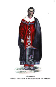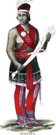 Writing in 1851 Morgan wrote that women's outfits consisted of a skirt (gä-kä'-ah) "usually of blue broadcloth, and elaborately embroidered with bead-work. It requires two yards of cloth, which is worn with the selvedge at the top and bottom; the skirt being secured about the waist and descending nearly to the top of the moccasin." Under the skirt, between the knees and the moccasins, women wore leggings (gise'-hǎ), called pantalettes by Morgan, "of red broadcloth, and ornamented with a border of beadwork around the lower edge ... In ancient times the gise'-hǎ was made of deer-skin and embroidered with porcupine-quill work." An over-dress (ah-de-a'-da-we-sa) of muslin or calico was worn over the skirt, it is "gathered slightly at the waist, and falls part way down the skirt ... In front it is generally buttoned with silver broaches." The blanket (e'yose) is two or three yards of blue or green broadcloth "it falls from the head or neck in natural folds the width of the cloth, as the selvedges are at the top and bottom, and it is gathered round the person like a shawl."[117]