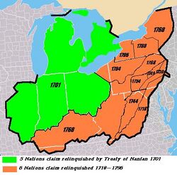 ![]() Map showing historical (in purple) and currently recognized (in pink) Iroquois territory claims. | |||||||||||||||||||||