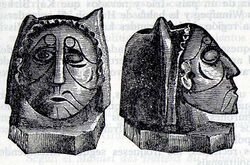 During healing ceremonies, a carved "False Face Mask" is worn to represent spirits in a tobacco-burning and prayer ritual. False Face Masks are carved in living trees, then cut free to be painted and decorated.[206] False Faces represent grandfathers of the Iroquois, and are thought to reconnect humans and nature and to frighten illness-causing spirits.[213] The False Face Society continues today among modern Iroquois. The Iroquois have three different medical societies. The False Face Company conducts rituals to cure sick people by driving away spirits; the Husk Face Society is made up of those who had dreams seen as messages from the spirits and the Secret Medicine Society likewise conducts rituals to cure the sick.[191] There are 12 different types of masks worn by the societies.[191] The types of masks are: A) The Secret Society of Medicine Men and the Company of Mystic Animals: 1) Divided mask that painted half black and half red; 2) Masks with exaggerated long noses; 3) Horn masks; 4) Blind masks without eye sockets. B) Husk Face Society: 5) Masks made of braided corn. C) False Face Society: 6) Whistling masks; 7) Masks with smiling faces; 8) Masks with protruding tongues; 9) Masks with exaggerated hanging mouths; 10) Masks with exaggerated straight lops; 11) Masks with spoon-lips; 12) Masks with a disfigured twisted mouth. The "crooked face" masks with the twisted mouths, the masks with the spoon lips and the whistling masks are the Doctor masks.[191] The other masks are "Common Face" or "Beggar" masks that are worn by those who help the Doctors.[173] The Husk Face Society performs rituals to communicate with the spirits in nature to ensure a good crop, the False Face Society performs rituals to chase away evil spirits and the Secret Medicine Society performs rituals to cure diseases.[215] The grotesque masks represent the faces of the spirits that the dancers are attempting to please.[191] Those wearing Doctor masks blow hot ashes into the faces of the sick to chase away the evil spirits that are believed to be causing the illness.[191] The masked dancers often carried turtle shell rattles and long staffs.[173]