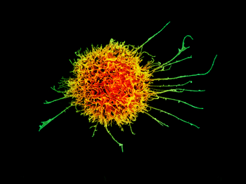 Natural killer cells (NK cells) do not directly attack invading microbes. Rather, NK cells destroy compromised host cells, such as tumor cells or virus-infected cells, recognizing such cells by a condition known as "missing self." This term describes cells with abnormally low levels of a cell-surface marker called MHC I (major histocompatibility complex) - a situation that can arise in viral infections of host cells.[10] They were named "natural killer" because of the initial notion that they do not require activation in order to kill cells that are "missing self." The MHC makeup on the surface of damaged cells is altered and the NK cells become activated by recognizing this. Normal body cells are not recognized and attacked by NK cells because they express intact self MHC antigens. Those MHC antigens are recognized by killer cell immunoglobulin receptors (KIR) that slow the reaction of NK cells. The NK-92 cell line does not express KIR and is developed for tumor therapy.[11][12][13][14]
