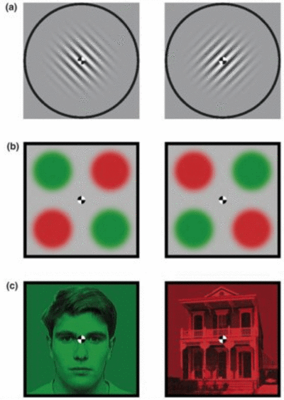 Left- and right-eye image differences along any one of a wide range of stimulus dimensions are sufficient to instigate binocular rivalry ( Figure 2). These include interocular differences in color, luminance, contrast polarity, form, size, or velocity. Rivalry can be triggered by very simple stimulus differences (e.g., gratings differing only in orientation) and by differences between complex images (e.g., pictures of a human face viewed by one eye and of a house viewed by the other). Stronger, high-contrast stimuli lead to stronger perceptual competition, as indicated by faster rivalry alternations. Interestingly though, even a faint low-contrast pattern that is barely visible will eventually suppress a strong one. Rivalry can even occur under dim (scotopic) viewing conditions, when light levels are so low they can only be detected by the retina's rod photoreceptors. Rivalry can be observed anywhere throughout the binocular visual field so long as the rival stimuli are adjusted for visibility. Under some conditions, rivalry can be triggered by physically identical stimuli that differ in appearance owing to simultaneous luminance or color contrast. Rivalry cannot be triggered, however, by global form differences between left- and right-eye images when the local elements comprising those forms are compatible between the eyes.