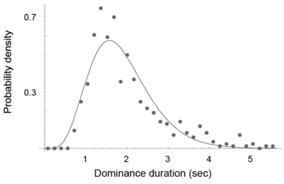 A widely used index of rivalry dynamics is predominance, the total percentage of viewing time that a given stimulus is dominant. Another important measure is dominance duration ( Figure 3), reflecting how long a given stimulus can maintain exclusive dominance, until its competitor finally breaks suppression. For left- and right-eye rival stimuli matched in strength and complexity, predominance tends to be equal, whereas predominance tips in favor of one stimulus simply by varying unilaterally the strength of one stimulus relative to the other (Levelt, 1965). Manipulation of stimulus variables such as luminance, contrast, contour density, spatial frequency, size, velocity, and visual field location can produce pronounced variations in alternation rate and in stimulus predominance. As a rule, a “stronger” rival target (e.g., one that is higher contrast than the other) enjoys enhanced predominance primarily by suppressing its competitor for longer periods of time. Increasing the strength of a rival target can sometimes weakly increase that target's dominance duration, but has a much greater influence in reducing the dominance duration of the competing target. This asymmetrical effect is predicted by reciprocal inhibition models of binocular rivalry.
