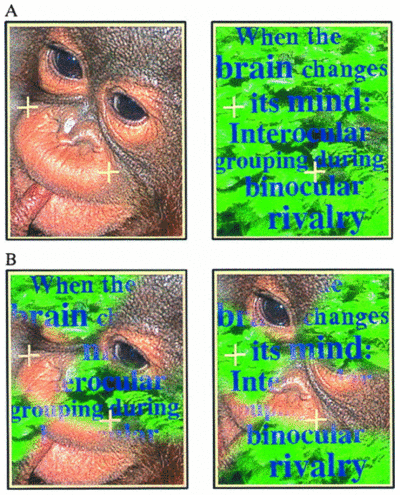 Yet other findings point to stimuli, not eyes, as the agents of rivalry. For example, rival targets differing in form and color can sometimes achieve states of dominance in which the color from one eye’s image combines in dominance with the form from the other eye’s image, temporarily producing a binocular impression corresponding to neither eye’s stimulus. Likewise, perceived direction of motion of a dominant stimulus can be influenced by the velocity of a suppressed stimulus. Results such as these show that perceptual experience during dominance phases of rivalry sometimes comprise an amalgam of attributes from both eyes’ views, which should be impossible if all information from a given region of one eye were lost during suppression. Also cited in support of stimulus-based rivalry is interocular grouping during rivalry ( Figure 4 and also Figure 2b), in which very specific combinations of left-eye and right-eye components achieve dominance simultaneously to form a coherent perceptual experience. Obviously, inputs from both eyes must be contributing to dominance in these instances. Such interocular grouping could occur at a binocular level of representation, after inputs from the two eyes have been combined, and also at the monocular level, with facilitatory interactions occurring between left-eye and right-eye neurons with similar feature preferences.