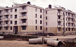 The villages most likely to be phased out were those with minimal prospects for growth. By the year 2000, 85% of communes were to have piped drinking water and 82% modern sewage.[4] According to a statement by the regime, by the year 2000, Romania expected "to eradicate basic differences between villages and cities and to ensure the harmonious development of all sections of the country".[5] Ceauşescu's declared aim - based on an original idea in the Communist Manifesto - was "to wipe out radically the major differences between towns and villages; to bring the living and working conditions of the working people in the countryside closer to those in the towns". He thought that by gathering people together into apartment buildings so that "the community fully dominates and controls the individual", systematization would produce Romania's "new socialist man". Ceaușescu was determined to revolutionize agriculture by increasing the cultivation area, while also stifling individual initiative and increasing centralization. The peasants were to receive derisory compensation for their demolished homes and then be charged rent for their new blocks, in which there was no accommodation for animals.[6] As Romanian historian Dinu Giurescu put it: "The ultimate goal is the proletarianization of our society. The final step in this process is the loss of the individual house.". It was an all-out effort at social engineering: kitchens and bathrooms were communal space in the government-owned and controlled apartments.[7] The number of villages was to be reduced to 5,000–6,000 (grouped in 2,000 communes), implying that 7,000–8,000 would be destroyed. Workers and intellectuals were to be settled in 3–4 storey buildings, with small blocks of 4 apartments or individual two-storey houses for the farmers. The countryside would be urbanized through 558 new agro-industrial towns. Although aspects of the program were absolutely necessary (improvement of services, diversification and stabilization of the workforce), it allowed little scope for local consultation and its implementation timespan was far too short (hence compulsory resettlement) with no realistic compensation for the required expropriation.[8]