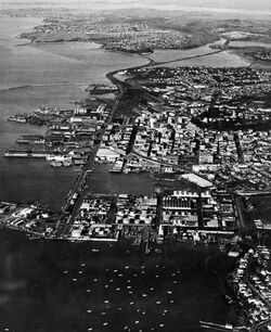 Trams and railway lines shaped Auckland's rapid expansion in the early first half of the 20th century. However, after the Second World War, the city's transport system and urban form became increasingly dominated by the motor vehicle.[38] Arterial roads and motorways became both defining and geographically dividing features of the urban landscape. They also allowed further massive expansion that resulted in the growth of suburban areas such as the North Shore (especially after the construction of the Auckland Harbour Bridge in the late 1950s), and Manukau City in the south.[42]