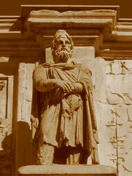 After Augustus's victory in the civil wars, the Romans punished the Dacian ruler, who was apparently defeated in battle around 25 BC.[45] In his account of his achievements as emperor, the Res Gestae, Augustus claimed that the Dacians had been subdued. This was not entirely true, because Dacian troops frequently crossed the Danube to ravage parts of Pannonia and Moesia.[46] He may have survived until the campaign of Marcus Vinicius in the Dacian area c.9 BC. Vinicius was the first Roman commander to cross the Danube and invade Dacia itself. Ioana A. Oltean argues that Cotiso probably died at some point during this campaign.[47] According to Jordanes Cotiso was succeeded by Comosicus, about whom nothing is known beyond the name.[47] King Scorilo was Comosicus' successor and may have been the father of Decebalus. The Roman historian Jordanes lists a series of Dacian kings before Decebalus, placing a ruler called "Coryllus" between Comosicus and the independently attested Duras, who preceded Decebalus as king. Coryllus is supposed to have presided over a long peaceful 40-year rule, however, the name Coryllus is not mentioned by any other historian, and it has been argued that it "is a misspelling of Scorilo, a relatively common Dacian name".[48] On this basis, Coryllus has been equated with the Scorilo named on an ancient Dacian pot bearing the words “Decebalus per Scorilo”. Though far from certain, this has also been translated as "Decebalus son of Scorilo". If so, this might mean that Decebalus was the son of Scorilo, with Duras possibly being either an older son or a brother of Scorilo.[49] A Dacian king (dux Dacorum) called Scorilo is also mentioned by Frontinus, who says he was in power during a period of turmoil in Rome.[50] From this evidence and references to Dacian kings elsewhere, it is suggested that Scorilo probably ruled from the 30s or 40s AD through to 69–70.[50]