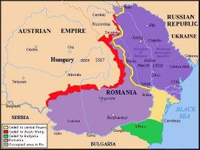 Under the terms of the Treaty of Bucharest, Romania would lose all of Dobruja to Bulgaria, all the Carpathian passes to Austria-Hungary and would lease all of its oil reserves to Germany for 99 years.[246][247] However, the Central Powers recognized Romania's union with Bessarabia who had recently declared independence from the Russian Empire following the October Revolution and voted for union with Romania in April 1918.[248] The parliament signed the treaty, however King Ferdinand refused to sign it, hoping for an Allied victory on the western front.[244] In October 1918, Romania renounced the treaty and on 10 November 1918, one day before the German armistice, Romania reentered the war after the successful Allied advances on the Macedonian front and advanced in Transylvania. The next day, the Treaty of Bucharest was nullified by the terms of the Armistice of Compiègne.[249][250] Total Romanian deaths from 1914 to 1918, military and civilian, within contemporary borders, were estimated at 748,000.[251]