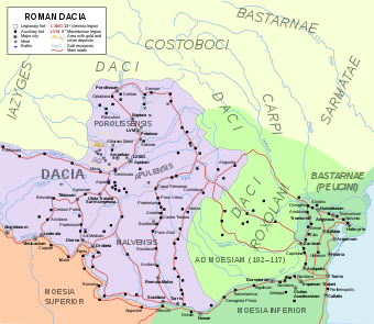 The first settlement at Sarmizegetusa was made up of Roman citizens who had retired from their legions.[89] Based upon the location of names scattered throughout the province, it has been argued that a large percentage of colonists originated from Noricum and western Pannonia.[90] Specialist miners (the Pirusti tribesmen)[91] were brought in from Dalmatia.[92]