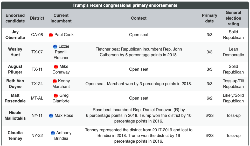 For more of the president's 2020 endorsements, as well as endorsements from previous election cycles, click here.