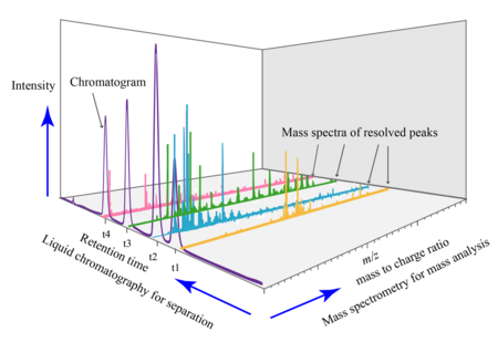 Liquid chromatography–mass spectrometry (LC–MS) is an analytical chemistry technique that combines the physical separation capabilities of liquid chromatography (or HPLC) with the mass analysis capabilities of mass spectrometry (MS). Coupled chromatography – MS systems are popular in chemical analysis because the individual capabilities of each technique are enhanced synergistically. While liquid chromatography separates mixtures with multiple components, mass spectrometry provides spectral information that may help to identify (or confirm the suspected identity of) each separated component.[1] MS is not only sensitive, but provides selective detection, relieving the need for complete chromatographic separation.[2] LC–MS is also appropriate for metabolomics because of its good coverage of a wide range of chemicals.[3] This tandem technique can be used to analyze biochemical, organic, and inorganic compounds commonly found in complex samples of environmental and biological origin. Therefore, LC–MS may be applied in a wide range of sectors including biotechnology, environment monitoring, food processing, and pharmaceutical, agrochemical, and cosmetic industries.[4][5] Since the early 2000s, LC–MS (or more specifically LC–MS–MS) has also begun to be used in clinical applications.[6]