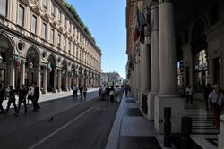 South of the Quadrilatero Romano stands Via Garibaldi, another popular street of the city. It is a 1 km (0.6 mi) pedestrian street between Piazza Castello and Piazza Statuto which features some of the old shops of the city. Large Piazza Statuto is another example of Baroque square with arcades.
