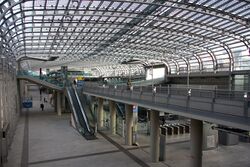 Another main street of downtown is Via Pietro Micca, which starts in Piazza Castello and ends in the large Piazza Solferino. The street continues in Via Cernaia up to Piazza XXV Dicembre, which features the former Porta Susa passengers building, relocated in 2012 a little more southward. The new and larger passengers building is situated between Corso Bolzano and Corso Inghilterra and is an example of contemporary architecture, being a 300 m-long (980 ft) and 19 m-high (62 ft) glass and steel structure. Porta Susa is currently the international central station of the city (high speed trains to Paris) and it is becoming the central hub of railway transportation of the city, being the station in which local trains (so-called Ferrovie Metropolitane), national trains and high-speed national and international trains converge.