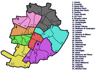 Turin is split up into 8 boroughs, locally called circoscrizioni;[33] these do not necessarily correspond to the historical districts of the city, which are rather called quartieri, rioni, borghi, borgate or zone. The "circoscrizioni" system originally comprised 10 of them, that were reduced to 8 by merging borough 9 into 8, and 10 into 2.